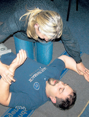Erste-Hilfe-Training: Britta Hinz legt René Buchinski in die stabile Seitenlage.