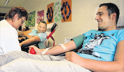 Bergen / Garz –– Beate Schiller und Steve Fieberg liegen auf der Pritsche. Im Arm eine Nadel, neben der Liege füllt sich langsam ein Beutel mit Blut. Neben ihnen lassen sich vier andere Insulaner ebenfalls gerade den Lebenssaft abnehmen. Dahinter:Eine volle Stuhlreihe mit weiteren sechs Kandidaten und einelange Schlange mit Spendenwilligen,die bis nach draußen reicht.