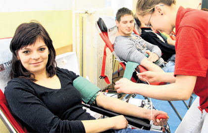 Blutspende an der Berufsschule: Lisa Reinhardt aus Binz ließ sich von Schwester Mandy "anzapfen". Foto:Dieter Lindemann